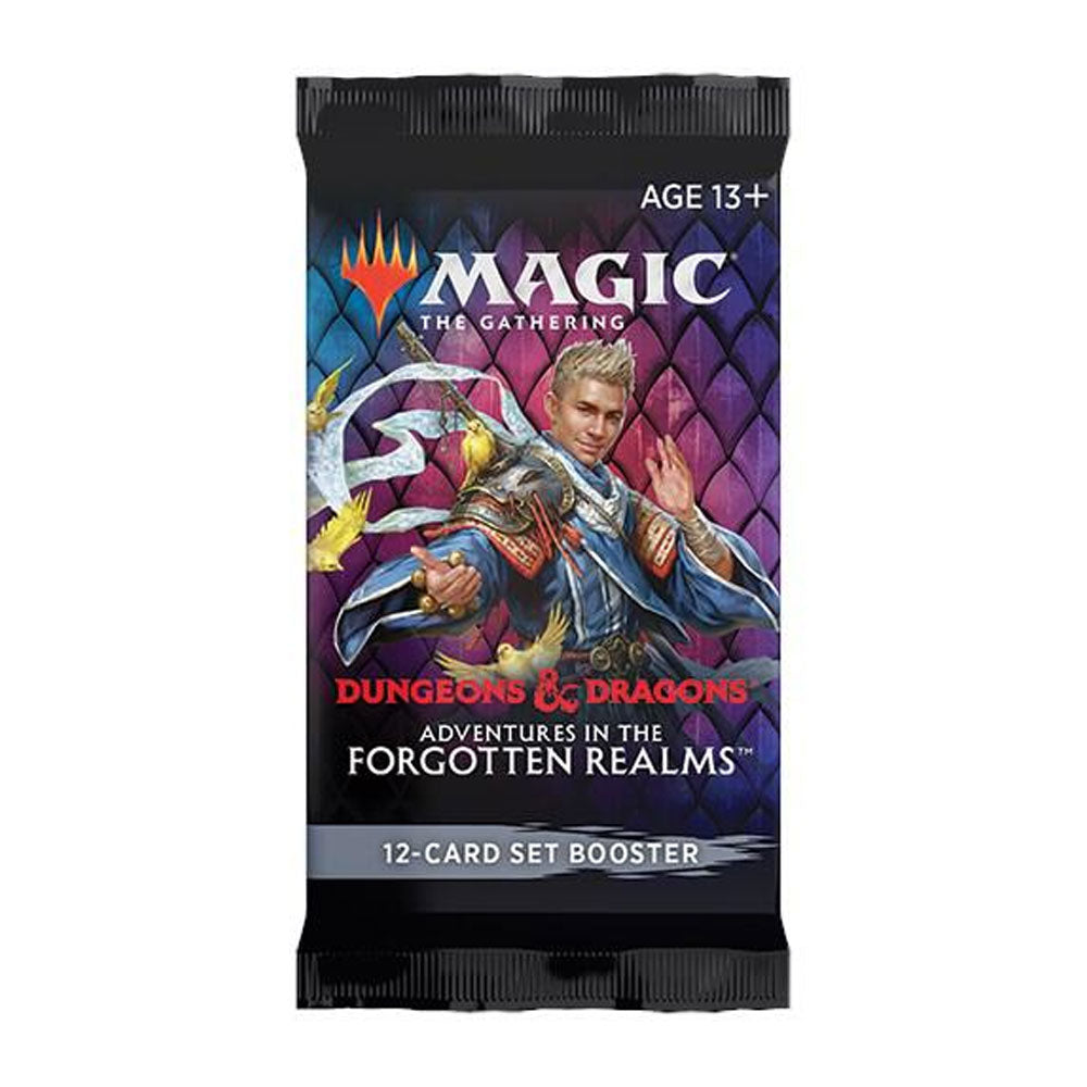 The Adventures in the Forgotten Realms Set Booster Pack contains 12 Magic cards, 1 Art Card (includes a D&D monster stat block on the back in 33% of packs), and 1 token, ad card, or special card from Magic's history (a card from "The List"). Each pack contains a combination of 1–4 Rares or Mythic Rares, 7–10 Uncommons and Commons (maximum of 7 may be Uncommon), and 1 Land card. One non–Art Card and non–Land card of any rarity is a traditional foil. A foil-stamped Signature Art Card replaces the Art Card in 5% of Set Boosters. A card from The List replaces the token or ad card in 25% of Set Boosters.