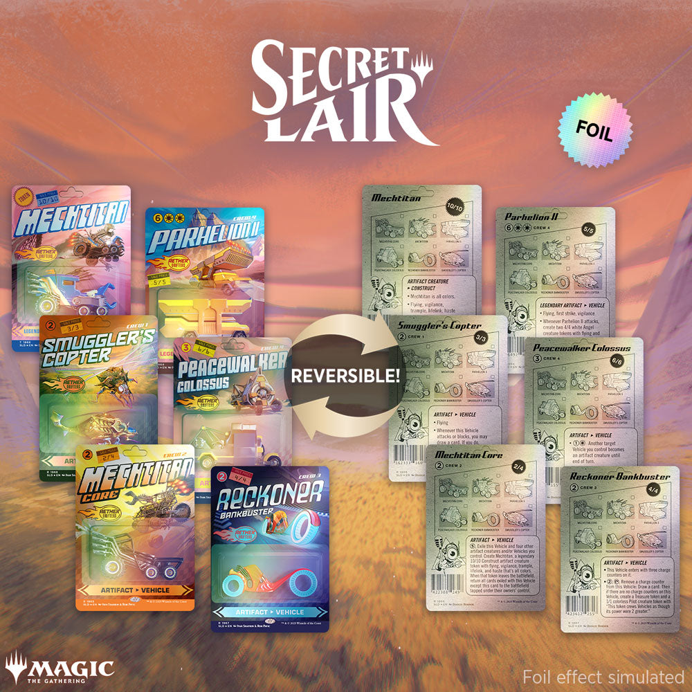 Buckle-up, speedsters, an all-new set of Aether Drifters race cards are zooming from the Ghirapur Grand Prix racetrack to your front door. These high-octane, reversible cards feature some of Magic’s most action-packed vehicles with all-new toy car art. So blast your turbo boosters and catch ’em before they speed away.